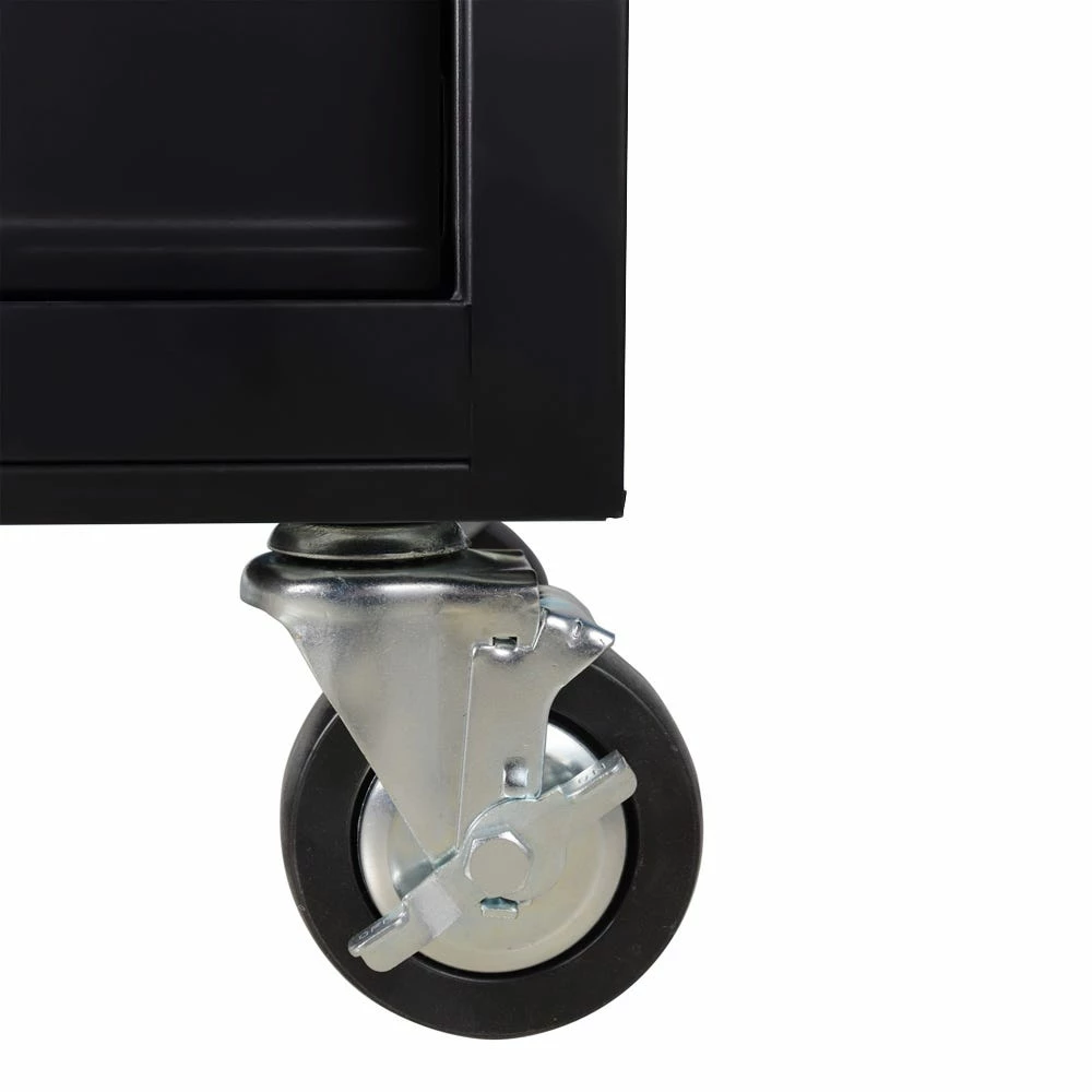 The Crimson 9 drawer bottom tool cabinet features, soft assist, auto close drawers. The cabinet is great for storing and organizing all your larger hand tools. Includes industrial black powder coat paint, 100 pound weight rated full-extension drawer slides. Total weight capacity of the chest is 1200 lbs on 4 each, 5 x 2 inch heavy duty castors. Includes 2 keys, for added security.